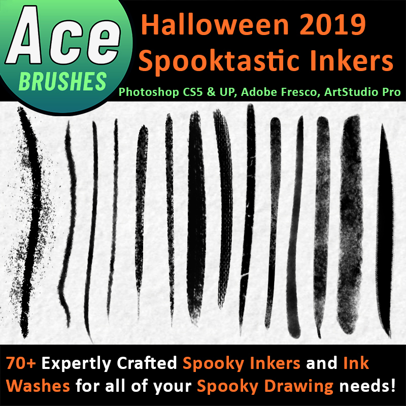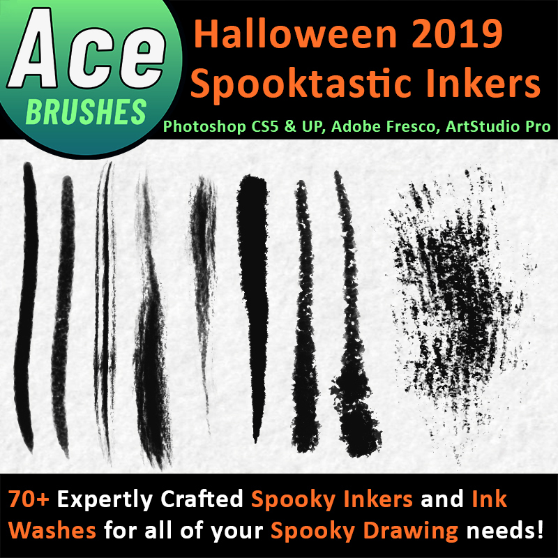 Contains 70+ Expertly Designed Spooky Inkers and Ink Washes (Compatible with Photoshop/Adobe Fresco/Art Studio Pro). These brushes were carefully crafted to bolster all manners of Halloween season art. They offer a high level of control with just enough grungy, natural, and 'spooky' elements to make them the perfect Inkers for Halloween and beyond!